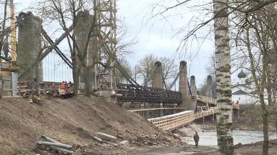 Временную переправу через реку Великую установили в Острове пока ремонтируют цепные мосты. Это крытый деревянный переход с лестницей и пандусом. Пока только у одного пролёта моста - Северного. Движение по нему для пешеходов закрыто. На самом объекте уже начались работы. Специалисты снимают металлические ограждения, которые будут отреставрированы; готовят переправу к замене покрытия. Воспользоваться деревянным переходом могут как пешеходы с колясками, так и велосипедисты.