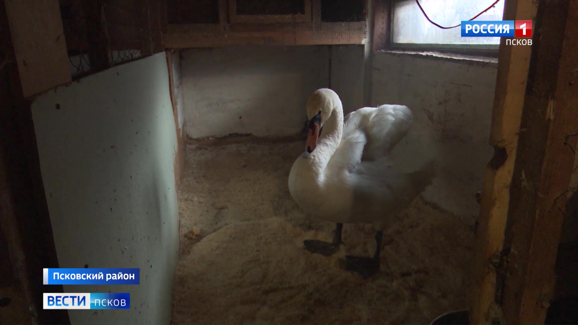 В псковском подворье "Птичий дворик" новый подопечный. Здесь выхаживают раненого лебедя. У него повреждена фаланга крыла. Лебедь проходит реабилитацию, до весны точно останется здесь. Птица находится в теплом вольере. Гостей встречает громким шипением.