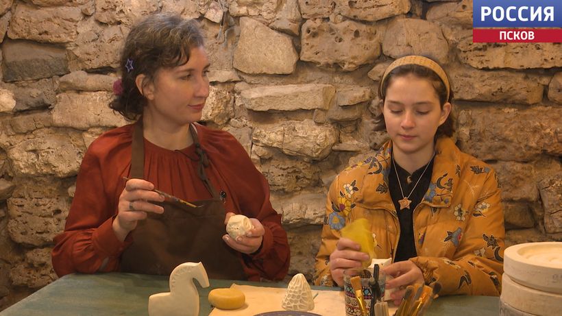 Зимой, когда гостей становится меньше, собираются в маленькой уютной компании и делятся опытом друг с другом. На этот раз решили сделать тарелочки - в пластовой технике ручной лепки. Среди подмастерьев и Екатерина Белоусова. В Сигово у нее своя мастерская - по изготовлению интерьерных игрушек из старинной амбарной доски.