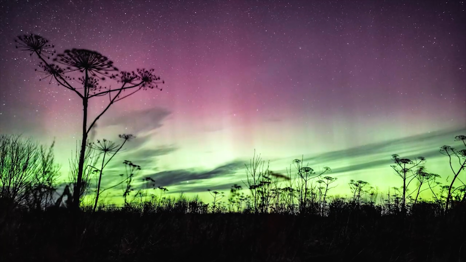 Настоящее ночное световое представление можно было увидеть на выходных в Псковском районе. В объектив астрофотографа Михаила Прохоренко попало полярное сияние. Цвета менялись от темно-красного до фиолетового и различных оттенков зеленого на горизонте. Необычное для наших широт небесное явление возникает, когда магнитосфера земли взаимодействует с заряженными частицами солнечного ветра.